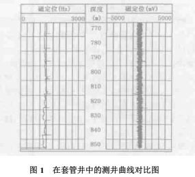 圖3是在中31- PXX籠統(tǒng)聚驅(qū)井中的測(cè)井曲線。測(cè)試條件是井內(nèi)既有油管又有套管。在1124m以上是內(nèi)徑為62mm油管段 ,以下是內(nèi)徑為124.6mm的套管段,儀器居中測(cè)井。左側(cè)是原磁性定位曲線,在油管段測(cè)速是900m/h,曲線有部分干擾;在套管段測(cè)速是90m/h,接箍曲線幅度低,部分接箍不能確定其具體位置。右側(cè)是更換后的接箍曲線,測(cè)井速度 100m/h,在油管段由于管柱內(nèi)徑小,曲線整體幅度高,接箍顯示清楚,1113m~1115m之間是封堵器,1124m處是油管喇叭口;在套管段由于管柱內(nèi)徑大,曲線整體幅度低,接箍顯示清楚。圖中不僅清楚地顯示出油管和套管的接箍位置,而且還能通過(guò)管柱內(nèi)徑的變化反映出不同的管柱結(jié)構(gòu)。