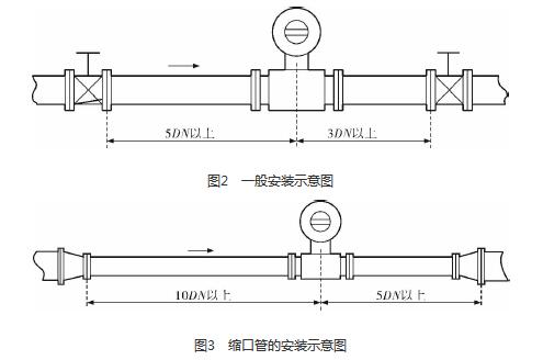 堿液計(jì)量表的安裝質(zhì)量對(duì)其測量結(jié)果的影響較大,因此在安裝時(shí)需要注意幾個(gè)問題。*先,堿液計(jì)量表直管段的選擇在配管時(shí)一定要按照要求進(jìn)行選擇,一般選擇流量計(jì)通徑與工藝管道通徑相同,即可滿足工程需要,而且安裝方便、壓力損失小,流量計(jì)直管段上游側(cè)的長度不少于5倍工藝管道直徑,下游側(cè)的長度不少于3倍工藝管道直徑(圖2)。但在流速太慢而又要求精度較高或需要變徑的應(yīng)用場合,可選擇通徑小于工藝管道通徑的流量計(jì),以提高測量精度,此時(shí)流量計(jì)上、下游必須加裝異徑管,且進(jìn)口異徑管上游側(cè)應(yīng)有長于10倍工藝管道直徑的直管段,下游側(cè)應(yīng)有長于5倍工藝管道直徑的直管段(圖3)。
