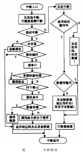 在HART通信中,雨水流量計(jì)作為從設(shè)備進(jìn)行通訊,所以這里的軟件設(shè)計(jì)只是針對(duì)于從設(shè)備。HART通信采用水平和垂直校驗(yàn)的方法。當(dāng)檢測(cè)到接收數(shù)據(jù)有差錯(cuò)時(shí),則等到主設(shè)備命令幀發(fā)完后,通知主設(shè)備數(shù)據(jù)接收有誤。主設(shè)備則重新發(fā)命令幀,從而保證通信的準(zhǔn)確可靠。HART中斷子程序流程圖如圖6所示。由于HART通信為主從方式,HART幀中每個(gè)字節(jié)在物理層傳輸需要9ms左右,為了保證通訊的實(shí)時(shí)性,通訊程序采用串行口終端接收/發(fā)送。該中斷所要完成通信中的主要任務(wù),即接收和發(fā)送幀,幀的拆分和打包。