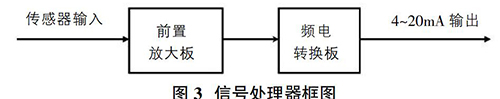 信號(hào)處理器對(duì)渦街流量傳感器產(chǎn)生的頻率信號(hào)經(jīng)過(guò)濾波、放大、頻電轉(zhuǎn)換等幾個(gè)環(huán)節(jié)處理,*終將頻率信號(hào)轉(zhuǎn)換為標(biāo)準(zhǔn)4~20mA信號(hào)輸出。信號(hào)處理器框圖如圖3所示。