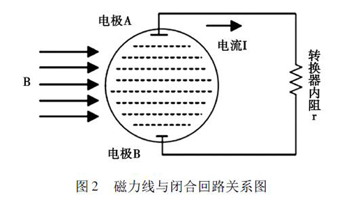 2. 1 正交干擾衛(wèi)生型卡箍電磁流量計(jì)的磁路系統(tǒng)包含有兩個(gè)勵(lì)磁線圈,而導(dǎo)管內(nèi)的液體與傳感器電極及轉(zhuǎn)換器結(jié)構(gòu)組成了一個(gè)閉合的回路,如圖2 所示。理論情況下,磁力線( 圖中B) 應(yīng)與閉合回路相平行,但是由于裝配過程中的誤差,導(dǎo)致磁力線不可能完全平行于這一閉合回路,出現(xiàn)部分磁力線成一定角度穿過回路的現(xiàn)象,這引起了即使沒有液體流動(dòng)的情況下,傳感器的電極上也會(huì)產(chǎn)生感應(yīng)電動(dòng)勢(shì),就形成了正交干擾的基本形式。