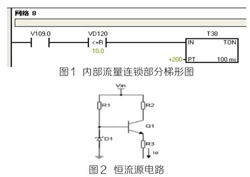 (2)PLC及模塊。PLC及模塊是自動(dòng)化控制系統(tǒng)主要設(shè)備,且PLC及模塊屬于高集成高精密電子設(shè)備,保持室內(nèi)整潔舒適,可以提高自動(dòng)化系統(tǒng)運(yùn)行穩(wěn)定性。PLC及模塊硬件運(yùn)行可靠,內(nèi)部控制程序是其控制核心軟件,如PLC硬件出現(xiàn)故障或損壞一般直接更換,但原內(nèi)部控制軟件無(wú)法上傳,整個(gè)控制系統(tǒng)成失控狀態(tài)。所以其內(nèi)部控制程序在調(diào)試驗(yàn)收合格后應(yīng)及時(shí)備份并做好標(biāo)記,為以后修復(fù)PLC故障提供保障。PLC系統(tǒng)的維護(hù)技術(shù)人員需掌握一定基礎(chǔ)PLC控制邏輯原理,對(duì)準(zhǔn)確判斷PLC故障點(diǎn)有很大的幫助。例如選礦廠(chǎng)水泵房S7-200系列PLC自動(dòng)抽水系統(tǒng)出現(xiàn)如下故障 :觸摸屏能控制變頻器啟動(dòng)水泵抽水,但在短時(shí)間內(nèi)會(huì)自動(dòng)停泵,導(dǎo)致無(wú)法正常抽水。通過(guò)故障現(xiàn)象可初步判斷PLC及模塊硬件設(shè)備正常,主要由于某個(gè)變量有問(wèn)題導(dǎo)致連鎖停機(jī)。打開(kāi)備份PLC控制梯形圖程序進(jìn)行相關(guān)分析,原來(lái)是水流量計(jì)瞬時(shí)流量數(shù)值做了連鎖,其在一定時(shí)間內(nèi)瞬時(shí)流量不大于10m 3 /h時(shí),自動(dòng)停泵,電磁流量模擬量輸出電流值僅為4ma且無(wú)變化,確定水流量計(jì)有故障。可臨時(shí)應(yīng)急維修,模擬量模塊輸入模擬電流值10ma~20ma之間一固定數(shù)值即可恢復(fù)正常運(yùn)行。制作簡(jiǎn)單恒流源電路代替水流量計(jì)輸出的模擬電流量,實(shí)現(xiàn)解決水泵無(wú)法正常運(yùn)行的故障。