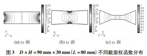 4) 圖 3( c) 、圖 4( c) 的 yz 面權(quán)函數(shù)分布表明,D = 90 mm時(shí)的權(quán)函數(shù)等勢(shì)線間距略大于 D = 60 mm 時(shí)的權(quán)函數(shù)等勢(shì)線間距,權(quán)函數(shù)變化梯度較小,且中心區(qū)域的權(quán)函數(shù)等勢(shì)線逐漸變?yōu)橹本€,因此 D = 90 mm 的權(quán)函數(shù)分布更均勻一些,但是兩者區(qū)別很小,即寬度改變對(duì) yz 面權(quán)函數(shù)分布影響很小。圖 4( c) 、圖 5( c) 的 yz 面權(quán)函數(shù)分布表明,H = 30 mm時(shí)的權(quán)函數(shù)等勢(shì)線間距較大,且中心區(qū)域的權(quán)函數(shù)等勢(shì)線逐漸變?yōu)橹本€,因此 H = 30 mm 的權(quán)函數(shù)分布更加均勻;