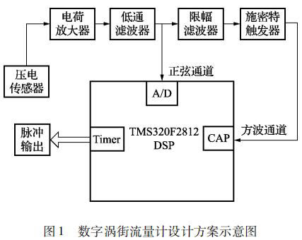 本文設計的基于 TMS320F2812 DSP 的數(shù)字煙氣流量計的信號處理系統(tǒng)由前置放大電路和數(shù)字信號處理電路兩部分組成。本文選用的前置放大電路即為目前被廣泛應用的普通煙氣流量計的前置放大電路,主要由電荷放大電路、低通濾波電路、限幅濾波電路和施密特觸發(fā)電路組成; 對于經(jīng)壓電傳感器測得的渦街信號采用了頻域分析和時域分析相結合的方式,即由前置放大電路和數(shù)字信號處理電路相配合。時域分析通道利用 DSP 事件管理器的捕獲模塊,對前置放大電路輸出的方波進行頻率計算,然后再由 DSP 事件管理器通用定時器的比較輸出模塊進行脈沖輸出。頻域分析通道即 DSP對低通濾波電路輸出的疊加了許多噪聲的正弦信號進行 A/D 采樣,再利用 DSP 對 A/D 采樣的結果進行頻譜分析,從而得出此時渦街信號的頻率,*后由 DSP 通用定時器的比較輸出模塊進行脈沖輸出。系統(tǒng)設計方案示意圖如圖 1 所示。