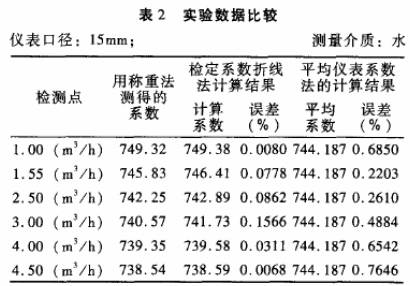 被檢儀表:公稱(chēng)通徑分別為10mm和15mm的渦輪流量傳感器各一臺(tái);檢定裝置:靜態(tài)稱(chēng)重法標(biāo)準(zhǔn)水流量檢定裝置,系統(tǒng)精度+0.2%。分別采用常規(guī)的平均儀表系數(shù)法和檢定系數(shù)折線法進(jìn)行標(biāo).定,并與作為標(biāo)準(zhǔn)的靜態(tài)稱(chēng)重法的檢定結(jié)果進(jìn)行比對(duì),結(jié)果見(jiàn)表1.表2。