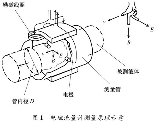 乙醇管道流量計(jì)的測量原理如圖 1 所示。根據(jù)法拉*電磁感應(yīng)定律,導(dǎo)電液體在磁場中流動會產(chǎn)生電動勢 E,它與磁感應(yīng)強(qiáng)度 B、導(dǎo)電液體平均流速 v 成一定比例關(guān)系: