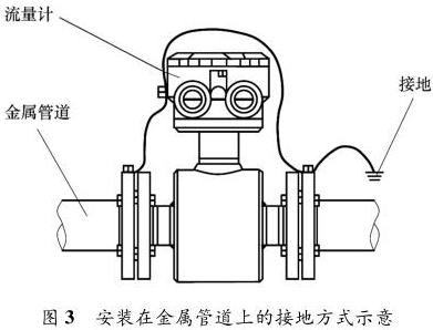 液體流量計安裝在金屬管道上,安裝時將金屬管道與液體流量計相連接,接地線再接入接地網(wǎng),如圖 3 所示。
