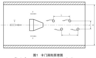 氣體渦輪流量計(jì)實(shí)現(xiàn)流量測量的理論基礎(chǔ)是流體力學(xué)中**的“卡門渦街”原理,在流動(dòng)的流體中裝置一個(gè)非線性三角柱形體,即渦旋發(fā)生體,如圖 1 所示。當(dāng)流體沿渦旋發(fā)生體繞流時(shí),會(huì)在渦旋發(fā)生體下游產(chǎn)生兩列不對(duì)稱,但有規(guī)律交替地分離釋放出一系列漩渦束,只有當(dāng)兩渦漩列之間的距離 h 和同列的兩渦漩之間的距離 L 之比滿足 h/L=0.281 時(shí),所產(chǎn)生的渦街才是穩(wěn)定的。
