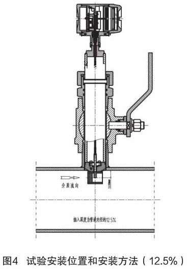 根據(jù)中華人民共和國機(jī)械行業(yè)標(biāo)準(zhǔn):JB/T9249-2015《煙氣流量計(jì)》進(jìn)行氣體渦輪流量計(jì)的研制與設(shè)計(jì)。在試驗(yàn)過程中,因?yàn)槔碚撗芯坎怀浞郑偌由辖?jīng)驗(yàn)不足,采用插入深度是按照以往其它產(chǎn)品(插入式電磁流量計(jì))的經(jīng)驗(yàn),以插入深度為現(xiàn)場管道內(nèi)徑的 12.5% 進(jìn)行試驗(yàn),其對(duì)介質(zhì)流量的檢測值與同種規(guī)格管道法蘭式結(jié)構(gòu)的煙氣流量計(jì)進(jìn)行比較,偏差值較大、儀表準(zhǔn)確度無法滿足設(shè)計(jì)要求。試驗(yàn)安裝位置和安裝方法如圖 4 所示。