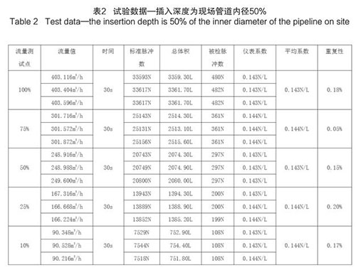 氣體渦輪流量計(jì)插入深度為現(xiàn)場管道內(nèi)徑的50%時(shí),試驗(yàn)數(shù)據(jù)如下(以 DN200 為例):