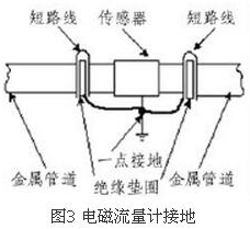 (4)盡量避開(kāi)振動(dòng)源、磁源(大功率電機(jī)、變壓器)由于水電磁流量計(jì)的測(cè)量感應(yīng)電壓很小,電壓較低,易受外界電磁噪聲的影響,故在安裝時(shí)應(yīng)進(jìn)行可靠的接地連(跨)接。金屬管道水電磁流量計(jì)接地連(跨)接方法如圖3所示