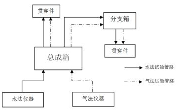 安全殼渦街蒸汽流量計(jì)以總成箱和分支箱為核心。試驗(yàn)初期,將總成箱置于儀器放置區(qū),分支箱置于貫穿件集中區(qū)域附近,檢漏儀至總成箱再至分支箱之間的管線固定連接,如圖2所示。水法試驗(yàn)管路與氣法試驗(yàn)管路互相獨(dú)立,總成箱和分支箱的每一路連接采用編號(hào)標(biāo)記進(jìn)行區(qū)分,并設(shè)置控制閥控制開關(guān)和流向。