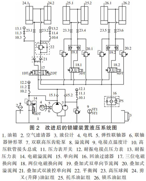 (4)液壓元件選型不合理。原液壓系統(tǒng)中選用 O型機(jī)能換向閥來實現(xiàn)在其行程的任意位置處對油缸組鎖緊,由于滑閥式換向閥的泄漏現(xiàn)象不可避免,僅適用于時間短且要求不高的回路,此鎖緊方式可靠性差。 另外本裝置安裝于惡劣的礦山環(huán)境下,由于缺乏回油過濾器,惡劣的礦山環(huán)境將會對系統(tǒng)油液嚴(yán)重污染,加重系統(tǒng)泄漏進(jìn)而失去保壓功能。