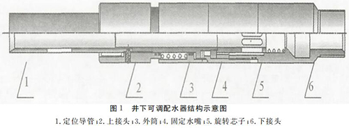 井下可調(diào)配水器主要由定位導管、上接 頭、外 筒、旋轉(zhuǎn)芯子、固定水嘴、下接頭等部件組成,如圖1