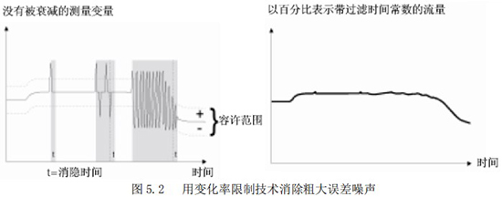 “變化率限制值”與“不敏感時(shí)間值”是用來消除某些增加阻尼不能除去的噪聲。它能夠從真實(shí)的流量信號(hào)中判別出階躍信號(hào)引起的噪聲和漿液尖狀噪聲。這種判別是以變化率的限制和持續(xù)時(shí)間為依據(jù)的。圖 5.2 所示為使用變化率限制技術(shù)去除粗大誤差的原理說明。該功能為在前面采樣中獲得的流量數(shù)據(jù)經(jīng)一階濾波后的,設(shè)定某一上限和下限(變化率)。如果當(dāng)前采樣的流量數(shù)據(jù)超過或低于這個(gè)極限值,而且在超過或低于這個(gè)極限值的變化時(shí)間之內(nèi),則認(rèn)為這種變化是由于噪聲所引起的,CPU 予以切除;而當(dāng)超過或低于這個(gè)極限值的變化在設(shè)置的不敏感時(shí)間以外,則認(rèn)為這種變化是由于真正的流量變化所引起,CPU 就認(rèn)可是測(cè)量流量的變化。