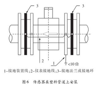 (2)傳感器在塑料管道上或在絕緣襯里的管道上安裝時(shí),如圖6,傳感器兩端必須安裝接地環(huán)或接地法蘭。使管內(nèi)流動(dòng)的被測(cè)介質(zhì)與大地短路,具有零電位,否則污水流量計(jì)無法正常工作。