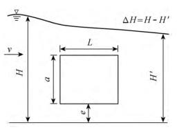 有限水域的浮體結(jié)構(gòu)在不同來流動(dòng)水中運(yùn)行時(shí),浮體結(jié)構(gòu)位置的改變會(huì)對(duì)流場產(chǎn)生影響,從而影響浮體結(jié)構(gòu)的泄流能力以及穩(wěn)定性。試驗(yàn)過程中固定浮體結(jié)構(gòu)的體型不變(長L=0.20m,寬B=0.30m,高a=0.10m),分別選取4種不同來流流量Q及浮體結(jié)構(gòu)位置e,控制浮體結(jié)構(gòu)在上、下游水位不變的條件下進(jìn)行試驗(yàn),具體試驗(yàn)參數(shù)設(shè)計(jì)及說明見表1以及圖2。