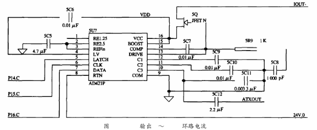 HT2012需要外部提供460.8kHz的時鐘信號,且要求時鐘頻率的誤差是0.1%,若直接入一個460.8kHz的晶振不僅會引起系統(tǒng)功耗的增加,而且該晶振屬于非標準晶振,需專門定制。為了解決這一問題,在系統(tǒng)中采用一片1.8432MHz的晶振以產(chǎn)生時鐘信號,再經(jīng)分頻器CD4013進行4分頗,可輸出1.8432MHz/4=460.8kHz的分頻信號供HT2012使用。AD421其內(nèi)部的電壓調(diào)節(jié)器與外部的場效應管DN25D對輸入到AD421的電壓進行調(diào)整,可提供+3.3V電壓作為其他設備的電源。HART發(fā)出的FSK信號,經(jīng)過一個電容耦合送到AD421中,轉換成相應的0.5mA正弦電流信號,實現(xiàn)電壓信號到電流信號的轉換,同時,疊加在4~20mA的電流上送給接收設備,實現(xiàn)了HART協(xié)議的信息的交換。本電路耦合電容取為0.0033μF,如圖5所示。