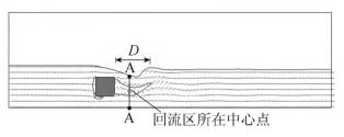 來自上游的水體經浮體結構的阻擋作用,水流繞流經浮體結構的上部和下部區(qū)域通過,并在浮體結構背水面的下游區(qū)域形成小范圍回流區(qū),此處水流紊亂,流速分布不均勻。試驗過程中,對回流區(qū)沿水流方向的長度D(水槽縱向中心斷面處,自浮體結構背水面到沿水流方向流速為0的*遠位置點)進行量測。選取浮體結構下游區(qū)域回流區(qū)中心點所在斷面進行流速測量對比。流速測量斷面位置A-A見圖3。
