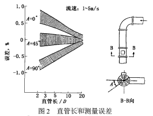 流體流過彎管后,下游產(chǎn)生流速分布畸變,若是兩只鄰近相接的不同平面彎管,除流速分布畸變外還會(huì)有漩渦。這些現(xiàn)象要影響裝在下游的大部分類型流量?jī)x表(除容積式等少數(shù)類型外)的測(cè)量值,因此通常要求在流量?jī)x表安裝點(diǎn)之前有一定長(zhǎng)度直管段,改善進(jìn)入儀表的流動(dòng)狀況。稀硝酸流量計(jì)受彎管影響較小,直管長(zhǎng)度要求也遠(yuǎn)低于節(jié)流差壓式、渦街式等其他流量?jī)x表。但是當(dāng)前稀硝酸流量計(jì)精度為測(cè)量值的0.5%,甚至0.2%~0.4%,即使影響量較小,還是受到人們的關(guān)注。