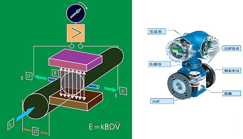 在結(jié)構(gòu)上,智能印染污水流量計(jì)由電磁流量傳感器和轉(zhuǎn)換器兩部分組成。傳感器安裝在工業(yè)過(guò)程管道上,它的作用是將流進(jìn)管道內(nèi)的液體體積流量值線性地變換成感生電勢(shì)信號(hào),并通過(guò)傳輸線將此信號(hào)送到轉(zhuǎn)換器。轉(zhuǎn)換器安裝在離傳感器不太遠(yuǎn)的地方,它將傳感器送來(lái)的流量信號(hào)進(jìn)行放大,并轉(zhuǎn)換成流量信號(hào)成正比的標(biāo)準(zhǔn)電信號(hào)輸出,以進(jìn)行顯示,累積和調(diào)節(jié)控制。