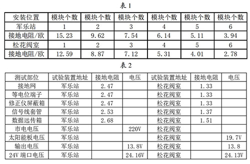 接地網(wǎng)的安裝與連接:接地網(wǎng)是整個乙二醇流量計(jì)防雷試驗(yàn)比較關(guān)鍵的一個內(nèi)容,能不能準(zhǔn)確的論證試驗(yàn)的有效性,必須保證接地網(wǎng)達(dá)到標(biāo)準(zhǔn)的接地電阻,通過對實(shí)地地電阻率的測試,初步選擇6個接地模塊埋設(shè)并配用降阻劑使用,邊安裝邊測試直到達(dá)到標(biāo)準(zhǔn)值后才引入等電位箱。在軍樂站和松花閥室安裝模塊并測試數(shù)據(jù)見表1。