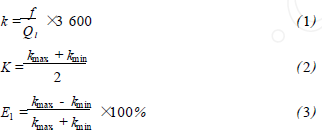 將過熱蒸汽流量計(jì)在標(biāo)準(zhǔn)水裝置上,分別用頻譜分析和脈沖計(jì)數(shù)的方法進(jìn)行標(biāo)定,流體介質(zhì)為水未加氣體,采用的標(biāo)準(zhǔn)傳感器為精度等級為0.2級的電磁流量計(jì)。在每個(gè)流量測量點(diǎn)上的儀表系數(shù)用公式(1)計(jì)算,然后用式(2)計(jì)算得到*終儀表系數(shù)K。Ql為被測水的流量值,f為每一個(gè)流量點(diǎn)得到的頻率,k為每個(gè)測量點(diǎn)得到的儀表系數(shù)。kmax、kmin分別為試驗(yàn)流量范圍內(nèi)得到的*大與*小的儀表系數(shù)。儀表系數(shù)的線性度E1用式(3)來計(jì)算。