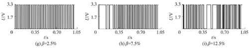 試驗(yàn)發(fā)現(xiàn),氣相的加入對過熱蒸汽流量計(jì)測量的影響顯著,譜分析和脈沖計(jì)數(shù)兩種方法隨著氣相注入的增加其表現(xiàn)也不同。圖4反映了水流量12m3/h時(shí),注入不同氣含率β時(shí)A點(diǎn)的模擬信號,如圖4(a~c)所示;經(jīng)譜分析后得到的頻率值,如圖4(d~f)所示;用脈沖計(jì)數(shù)方法得到的脈沖信號,如圖4(g~i)所示。圖4顯示,當(dāng)注入氣量不大時(shí),對過熱蒸汽流量計(jì)的影響不大,無論是譜分析結(jié)果還是脈沖計(jì)數(shù)得到的結(jié)果都比較好。當(dāng)注入的氣量進(jìn)一步增加時(shí),渦街原始信號強(qiáng)度和穩(wěn)定性逐漸變差,渦街頻率信號會被干擾信號所淹沒,反映到譜分析圖是,渦街頻率的譜能量減小,干擾信號的譜能量加強(qiáng);對于脈沖信號,會因?yàn)橐恍┬郎u信號減弱,形成脈沖缺失現(xiàn)象,而不能真實(shí)地反映渦街產(chǎn)生的頻率。