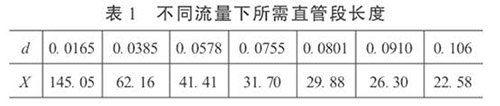 3.直管段長度和成品油流量計精度的初步預(yù)測在工程設(shè)計中,根據(jù)流體性質(zhì)、流量和雷諾數(shù)確定α和d值。這樣,按照式(5)就可以依不同的流量計精度要求,對直管段長度進(jìn)行初步預(yù)測,或確定直管段長度后,對流量計的精度做初步預(yù)測。當(dāng)δ= 0.2%時,不同流量下所需直管段長度見表1。