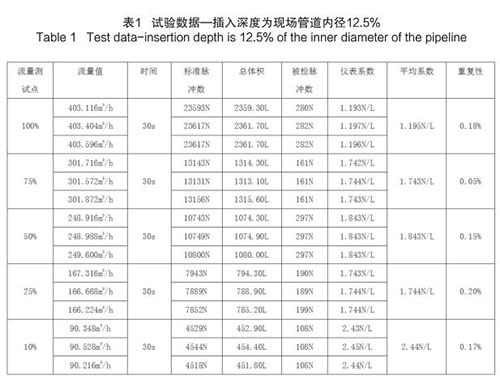 插入式煙氣流量計插入深度為現(xiàn)場管道內(nèi)徑的 12.5%時,試驗數(shù)據(jù)如下(以 DN200 為例):