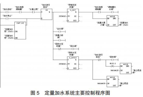定量加水系統(tǒng)的工作過程為:當(dāng)設(shè)定好加水量后,啟動系統(tǒng),多級離心泵 10、回流閥 4、出水閥 9 和流量計前閥 12開啟對管路進(jìn)行預(yù)填充;延時 30s 預(yù)填充完成后,回流閥 4關(guān)閉,調(diào)制罐補(bǔ)水閥 14 開啟,同時質(zhì)量流量計 13 開始計量;當(dāng)質(zhì)量流量計的累積量與設(shè)定加水量一致時,出水閥 9 和調(diào)制罐補(bǔ)水閥 14 關(guān)閉;調(diào)制罐定量加水完成后,開啟回收閥17 和回流閥 4 以及同未關(guān)閉流量計前閥 12 一起,利用壓縮空氣對管道中水實(shí)現(xiàn)回收;延時 30s 水回收完成后,關(guān)閉多級離心泵、球閥 4、12 和 17,定量加水過程完成。定量加水系統(tǒng)主要控制程序如圖 5 所示。