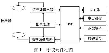 高頻勵磁防腐型電磁流量計(jì)由傳感器、高頻勵磁電路、信號處理電路等組成,其中高頻勵磁電路決定著傳感器磁場的強(qiáng)弱,勵磁電路的穩(wěn)定性以及精確性決定著系統(tǒng)檢測的準(zhǔn)確性以及穩(wěn)定性。DSP 系統(tǒng)控制勵磁電路激勵傳感器線圈,當(dāng)線圈中有導(dǎo)電液體流過時,其切割磁感線并在傳感器兩端的線圈上產(chǎn)生感應(yīng)電動勢,利用信號檢測電路監(jiān)測感應(yīng)電動勢的大小,*后根據(jù)相應(yīng)關(guān)系計(jì)算出液體的流量,系統(tǒng)硬件框圖如圖 1 所示。