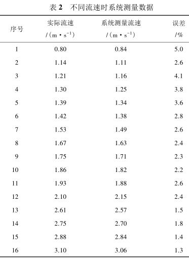 由表 2 測量數(shù)據(jù)可知,系統(tǒng)在測量低流速液體時(流速小于 1 m/s)誤差較大,達(dá)到 5%,當(dāng)待測液體的流速增大時(大于 1.4 m/s),誤差逐漸減小,基本維持在 3%以內(nèi)。由此可見系統(tǒng)具有較高的檢測精度,尤其是當(dāng)管道中的液體流速較高時,系統(tǒng)的檢測誤差不超過 3%,達(dá)到了設(shè)計(jì)預(yù)期。
