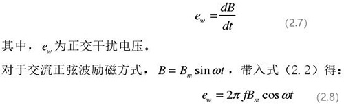 從上圖 2.5 中可以觀察到兩個電極、勵磁線圈、轉(zhuǎn)換器內(nèi)阻之間形成了一個閉合回路,將此回路稱之為初級繞組,從理論上進行分析,磁力線 B 應(yīng)當平行于勵磁線圈所產(chǎn)生的磁感應(yīng)線,但在實際的應(yīng)用過程中由于工藝差異,因此無法達到理想狀態(tài),會產(chǎn)生磁力線穿過勵磁線圈磁感應(yīng)線的情況,此時將會產(chǎn)生相應(yīng)的感應(yīng)電動勢,將此部分感應(yīng)電動勢稱為變壓器效應(yīng)。此效應(yīng)同樣滿足于楞次定律,利用楞次定律進行計算可得如下電動勢: