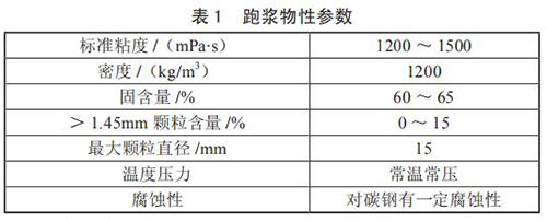 對(duì)跑漿進(jìn)行分析后發(fā)現(xiàn),跑漿是一種由煤漿和一些雜質(zhì)混合而成的半流體物質(zhì),當(dāng)甲烷流量計(jì)使用煤倉(cāng)中煤堆中上部煤時(shí),由于煤質(zhì)較好,跑漿中小煤塊極少,性質(zhì)同正常煤漿,只是固含量稍高;而使用煤堆底部的煤時(shí),煤質(zhì)差甲烷流量計(jì)研磨不充分,跑漿中含有約 15% 的小煤塊,分析后的跑漿物質(zhì)參數(shù)如表 1 所示。