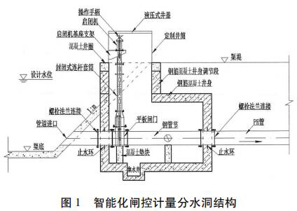 分水洞采用了一種封閉式啟閉閘集成閘井預(yù)制件,包括頂節(jié)、標(biāo)準(zhǔn)節(jié)和底座。與傳統(tǒng)現(xiàn)場澆筑的方式相比,集成閘井采用防水設(shè)計,并且安裝更加方便快捷,很大程度上提高了安裝效率,節(jié)約成本。采用事先預(yù)制好的啟閉閘支座、啟閉機(jī)機(jī)座,保證了設(shè)備的安裝精度,提高了設(shè)備運(yùn)行的穩(wěn)定性,減少了設(shè)備的后期維護(hù)。分水洞結(jié)構(gòu)除了預(yù)制混凝土外,還可考慮采用玻璃鋼或工程塑料整體制作,用標(biāo)準(zhǔn)節(jié)調(diào)節(jié)高度。分水洞結(jié)構(gòu)設(shè)計見圖 1。