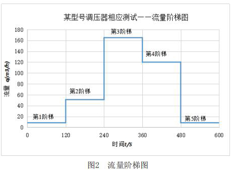 該測(cè)試主要利用實(shí)驗(yàn)室測(cè)試條件,模擬客戶現(xiàn)場(chǎng)使用情況。其主要測(cè)試內(nèi)容包括:測(cè)試高溫液體流量計(jì)在+23℃,-30℃和-40℃三種溫度下,高溫液體流量計(jì)出口壓力分別在2.1kPa和30kPa時(shí),流量分別從*1階梯到*5階梯時(shí)的響應(yīng)速度,客戶所提供的流量階梯如圖2所示。橫軸表示下游球閥開(kāi)啟動(dòng)作時(shí)間,縱軸表示高溫液體流量計(jì)下游需要的流量q。