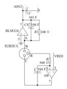 煙氣脫硫排放效果采樣模塊使用結構簡單、響應快、選擇性能好的 SO 2 -2000 傳感器,該傳感器為三極電化學傳感器,其 3 個引腳對應 3 個電極:工作電極 W、參考電極 R 和對電極 C。SO 2 -2000 傳感器利用工作電極與循環(huán)流化床dn150渦街流量計排放煙氣中的二氧化硫形成氧化反應,使工作電極上生成電流,電流強度同循環(huán)流化床dn150渦街流量計排放煙氣中二氧化硫濃度間成正比關系。由此通過對工作電極上電流的檢測即可計算出循環(huán)流化床dn150渦街流量計排放煙氣中二氧化硫的體積濃度。在氧化反應過程中,參考電極的主要作用是穩(wěn)定工作電極電勢。模數(shù)轉(zhuǎn)換裝置采用型號為 S3C2440A 的 ADC轉(zhuǎn)換器,以電壓替代傳感器工作電極上的輸出電流,進入 ADC 轉(zhuǎn)換器即可獲取循環(huán)流化床dn150渦街流量計排放煙氣中二氧化硫濃度的數(shù)字量。圖 3 所示為SO 2 -2000 傳感器的測量電路。