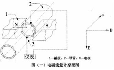 設在均勻磁場中,垂直于磁場方向有一個直徑為D的管道。管道由不導磁的材料制成管道內表面襯掛絕緣襯里。當導電的液體在導管中流動時,則導電液體切割磁力線,于是在和磁場及流動方向垂直方向上產(chǎn)生感應電勢,如安裝一對電極,則電極間產(chǎn)生和流速成正比例的電勢差。