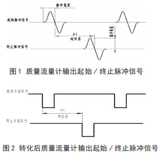 將智能型電磁流量計流量與相關(guān)測試設(shè)備連接起來,就可以進行智能型電磁流量計的校準(zhǔn),時間差△ t 由專用試驗測試設(shè)備可以測出。起始脈沖信號和終止脈沖信號如圖 1 所示。經(jīng)過專用試驗測試設(shè)備信號轉(zhuǎn)化后的信號方波如圖 2 所示。