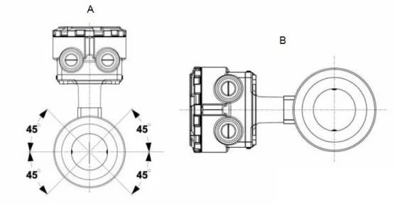 如果兩個(gè)測(cè)量電極處于 3 點(diǎn)鐘和 9 點(diǎn)鐘位置或與水平方向成 45 度以下角度,如 圖 3-4 左側(cè)所示,則傳感器電極的朝向正確。避免使傳感器的頂部與垂直位置成 90 度角(如 圖右側(cè)所示)的任何安裝朝向。