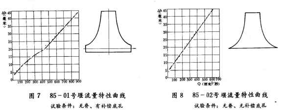 用85-01號和85-02號兩種雙曲線薄壁堰,在試驗水槽端安裝成無脊有補償孔和無補償孔兩種情況,進(jìn)行了多次實驗,所得數(shù)據(jù)通過整理,畫出流量特性曲線,見圖7和圖8。