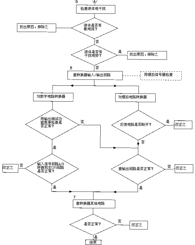 先在管系和流量傳感器內(nèi)通水,靜止無流動狀態(tài)下將轉(zhuǎn)換器兩信號端子和功能地或保護地端子短路,觀察轉(zhuǎn)換器輸出信號足否到零。若能到零,則可初步判斷故障在轉(zhuǎn)換之前而不在轉(zhuǎn)換器本身及后位儀表,下一步可先重點檢查連接電纜和傳感器(即流程圖*2項);若不能到零,則檢查重心應(yīng)在轉(zhuǎn)換器和后位儀表(即流程圖*3、4、6、7項)。